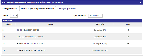 Obs. 4: a coluna Avaliação exibe a situação do apontamento da avaliação qualitativa para o aluno.
