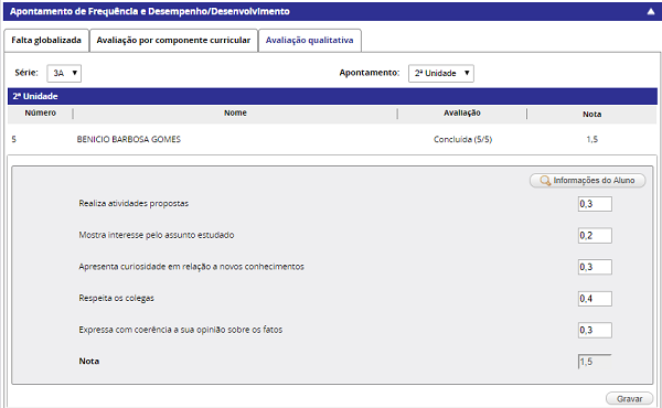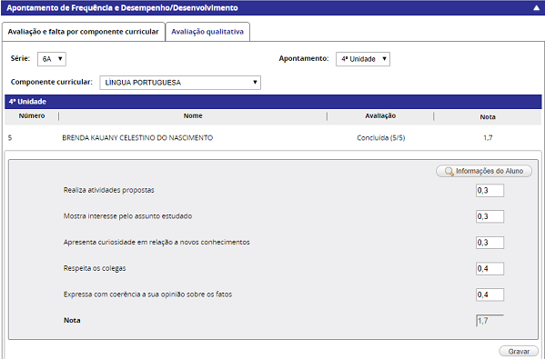 Permite realizar os apontamentos da avaliação qualitativa para as turmas com forma de avaliação por nota.
