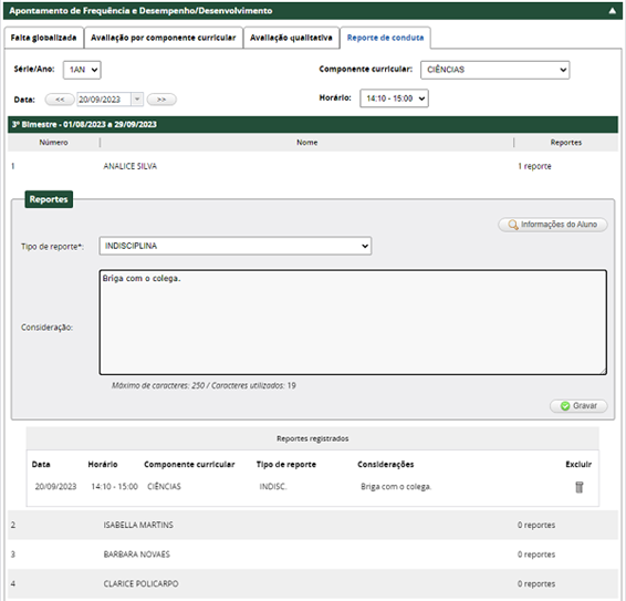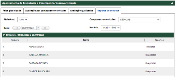 Obs. 1: se o aluno já tiver reporte de conduta informado, o número de reportes será exibido na coluna Reportes.