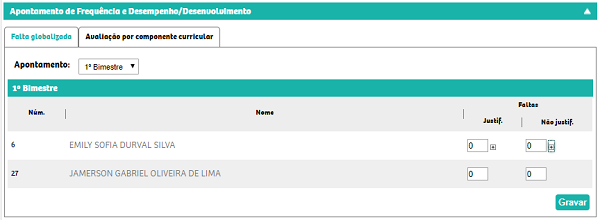 Faltas globalizadas - Tela destinada ao registro de faltas dos alunos durante o período de apontamento. Clique na aba Falta globalizada, no campo Apontamento informe o período para o qual deseja apontar as faltas. Na coluna Faltas informe a quantidade de faltas justificadas e não justificadas. Caso a maioria dos valores informados seja igual, utilize a função replicar, que repete o valor informado no primeiro campo para os demais. Para isso, informe no primeiro campo a quantidade de faltas e clique no ícone