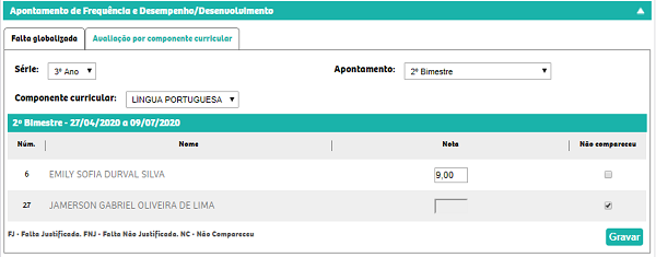 Para registrar o não comparecimento do aluno o usuário deverá marcar o campo NC referente ao aluno. Ao marcar NC em alguma Nota, o sistema considera nota igual a 0 (zero) para o cálculo.