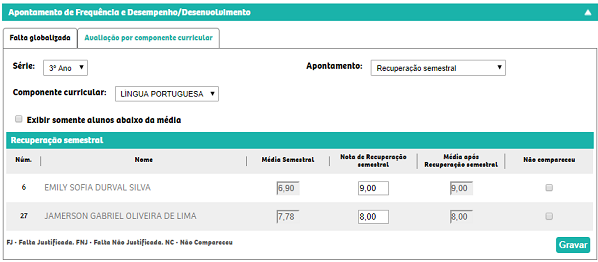 Recuperação semestral – Tela destinada à visualização e ao apontamento das notas referentes à recuperação semestral. Os filtros Série e Componente curricular devem ser informados. No campo Apontamento selecione a opção ‘Recuperação semestral’.