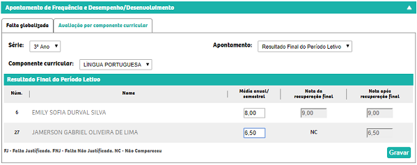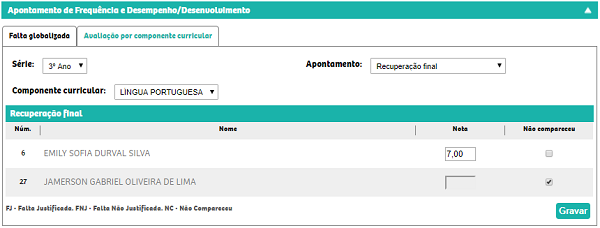 - Nota da recuperação final: que exibirá o valor informado no apontamento recuperação final.