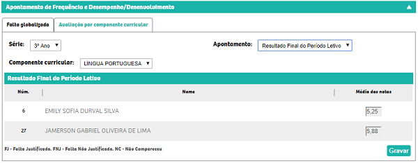 Resultado final do período letivo