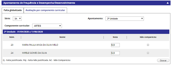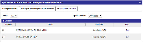 Permite efetuar o apontamento de frequência e desempenho/desenvolvimento para turmas globalizadas que realizam apontamento de avaliação qualitativa. O apontamento de desempenho pode ser por atividade avaliativa ou apenas o total do bimestre. As faltas podem ser globalizadas ou por componente curricular. A forma de apontamento das faltas e a forma de avaliação são definidas no cadastro da série.