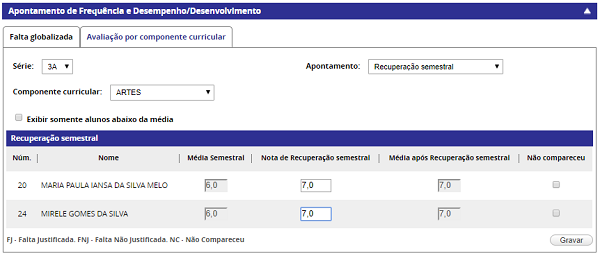 Ao selecionar o apontamento = ‘Recuperação semestral’ serão exibidas as colunas: