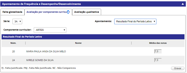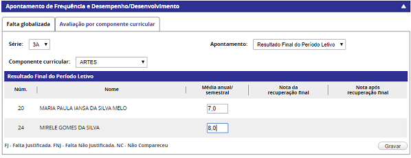 Para turmas que realizam o apontamento de frequência diário esta tela exibirá os dados desabilitada, e o apontamento das faltas será realizado na aba Apontamento diário de frequência.