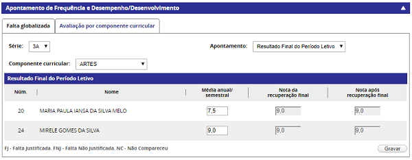 - Média após recuperação semestral: o sistema atualizará automaticamente a coluna considerando para o cálculo a maior nota entre o valor da média dos período apontados e o valor da recuperação semestral.