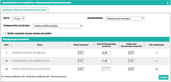 Ao selecionar o apontamento = ‘Recuperação semestral’ serão exibidas as colunas: