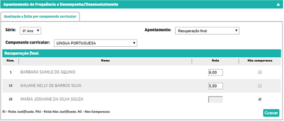 - Nota da recuperação final: que exibirá o valor informado no apontamento Recuperação final.