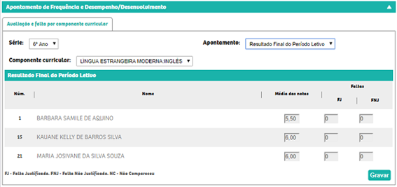 Avaliação e falta - Para turmas que não realizam apontamento de atividades avaliativas o usuário deverá lançar a nota total do período letivo para cada aluno. Os filtros Série e Componente curricular devem ser informados. No campo Apontamento selecione o período para o qual deseja lançar as notas.
