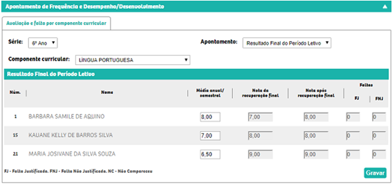 - Média após recuperação semestral: o sistema atualizará automaticamente a coluna considerando para o cálculo a maior nota entre o valor da média dos períodos apontados e o valor da Recuperação Semestral.