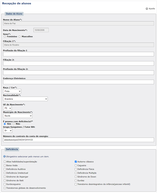 Dados dos alunos - Os campos Nome do Aluno, Data de Nascimento, Nome da Mãe, Raça / Cor, Nacionalidade, UF de Nascimento, Município de Nascimento, É pessoa com deficiência, devem ser informados. O campo É pessoa com deficiência quando informada opção ‘Sim’, é obrigatório informar o tipo de deficiência. O campo Registro nacional de estrangeiro, será disponibilizado quando a nacionalidade for diferente de brasileira e os campos RG e Certidão de nascimento não serão exibidos. Os campos Nome do pai (se o pai for selecionado como responsável pelo aluno está informação passa a ser obrigatória), Profissão do pai, Endereço eletrônico, Grupo sanguíneo / Fator RH e Número da conta de energia complementam os dados do aluno.