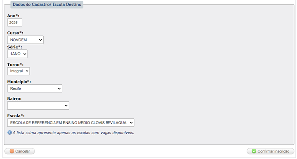 Dados do cadastro/ Escola de destino – Tela destina ao cadastro da escola destino do aluno. Os campos Ano, Curso, Série, Turno, Município, Bairro e Escola devem ser informados. O campo Bairro será carregado com os bairros do município informado no campo de mesmo nome.