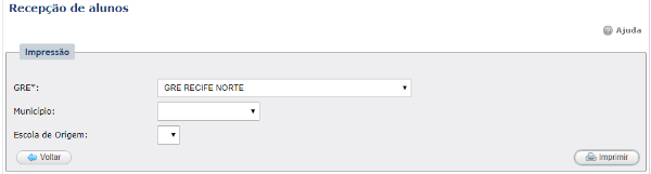 Imprimir – Funcionalidade destinada à impressão do relatório dos alunos cadastrados na recepção. O campo GRE deve ser informado, os campos Município e Escola de Origem ajudam a refinar a busca. Clique em Imprimir, será gerada a planilha contendo duas abas - Alunos da GRE e Alunos outras GREs. As planilhas apresentarão as colunas Dados do aluno - Nome do aluno, Data de nascimento, Sexo e Nome da mãe; Endereço - Bairro, Endereço, CEP, UF e Município; Escola de Origem – Município e Escola; Dados de matrícula/ Escola de destino – Ano, Curso, Série, Turno, Escola, Endereço, Bairro, Município e Situação.