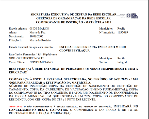 Será disponibilizado um comprovante de inscrição para ser impresso.