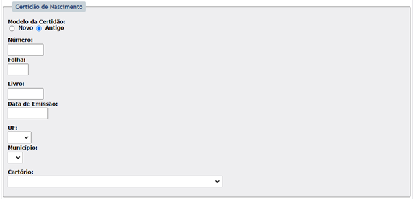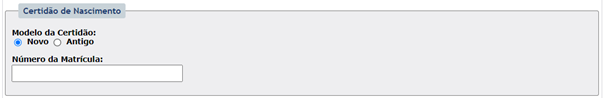 Certidão de nascimento - Certidão de nascimento – Selecionar se o Modelo da certidão é o antigo ou novo, no caso do modelo ‘Novo’, o sistema verifica se o número da matrícula é válido. Se a opção selecionada for 'Antigo’, informar os campos: Número, Folha, Livro, Data de emissão, UF certidão, Município certidão e Cartório.