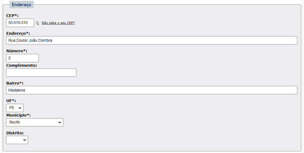 Endereço - Tela destinada ao cadastro do endereço residencial do aluno. Informe os campos CEP, Endereço, Número, Complemento, Bairro, UF, Município e Distrito. Ao preencher o CEP, os campos Endereço, Bairro, UF, Município, Distrito e Microrregião serão habilitados. Ao informar o CEP alguns campos do endereço serão preenchidos automaticamente. Caso o usuário não saiba o CEP, clique em ‘Não sabe o seu CEP?’, preencha os campos da tela de busca por endereço e clique em Pesquisar. O sistema responderá à pesquisa com o CEP cadastrado para o endereço pesquisado, selecione o CEP e clique em Selecionar.