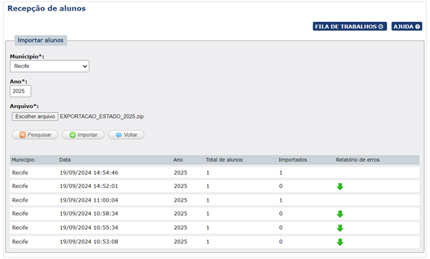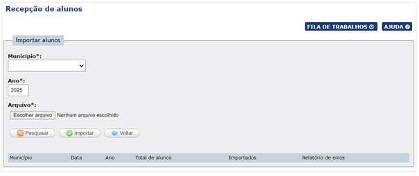 Pesquisar - Tela destinada à pesquisa dos arquivos já importados. Os filtros Munícipio, e Ano devem ser informados. A funcionalidade exibe os processamentos realizados com as seguintes informações: Munícipio, Data, Ano, Total de alunos, Importados (total de alunos importados) e Relatório de erros.