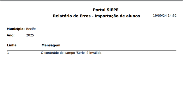 para baixar o resultado da pesquisa correspondente aos erros da importação. O arquivo conterá as seguintes informações: Município, Ano, Linha e Mensagem de erro.
