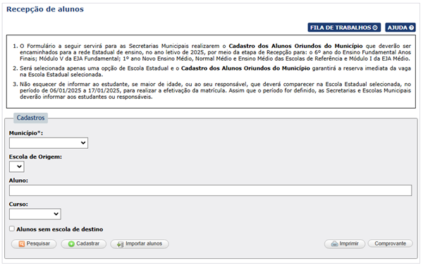 Tela destinada ao cadastro ou à importação dos alunos oriundos da rede municipal para realização do cadastrado na rede estadual para o ano seguinte. Alguns cursos/séries disponibilizados para essa etapa são: 6º ano do Ensino Fundamental Anos Finais, Fase III do EJA Fundamental, 1º ano do Ensino Médio Regular, Normal Médio, Novo Ensino Médio e Ensino Médio das Escolas de Referência e Módulo I do EJA Médio. Dessa forma, nesta tela estarão acessíveis apenas os cursos e séries que foram definidos pela Secretaria de Educação e devidamente parametrizados no portal.