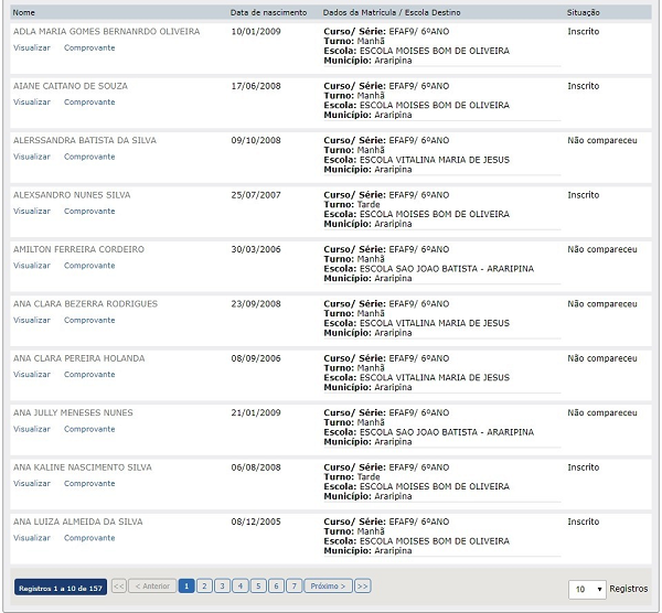 Clique em Comprovante, abaixo do nome do aluno, para exibir o comprovante de inscrição.