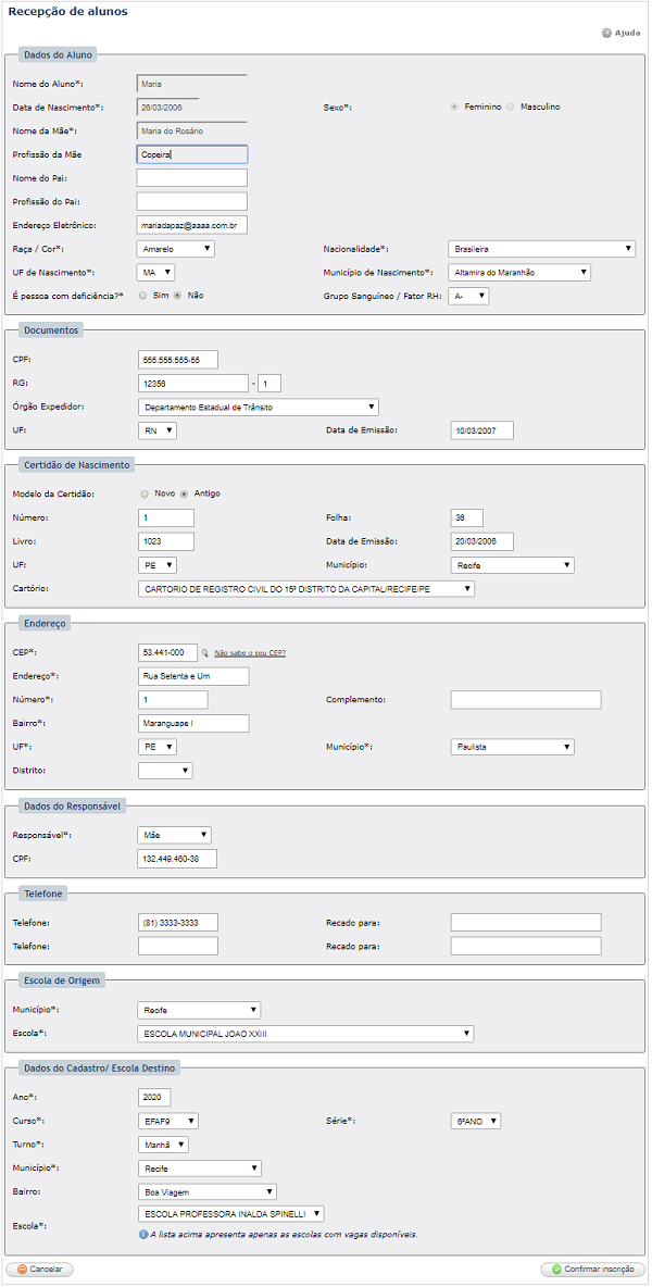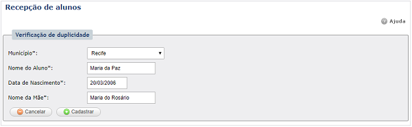Informe os campos Município, Nome do aluno, Data de nascimento e Nome da mãe.