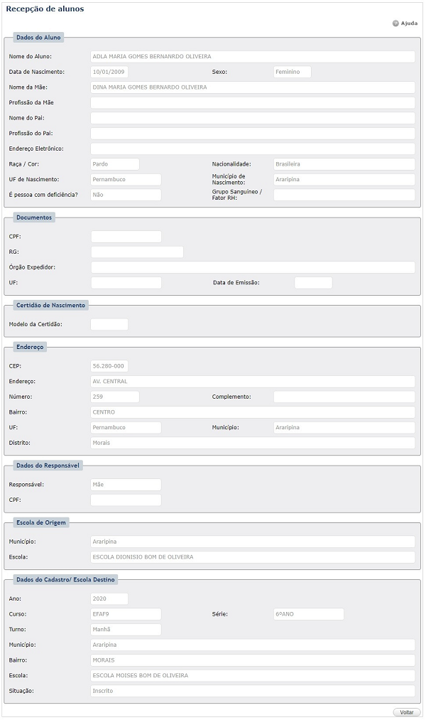 Visualizar - Tela destinada a visualização dos dados do aluno inserido na recepção. Clique em Visualizar abaixo do nome do aluno, a tela com as informações cadastradas do aluno será exibida. Se os campos da seção Certidão de Nascimento não forem preenchidos, o item Modelo de Certidão ficará oculto na visualização dos dados do aluno.
